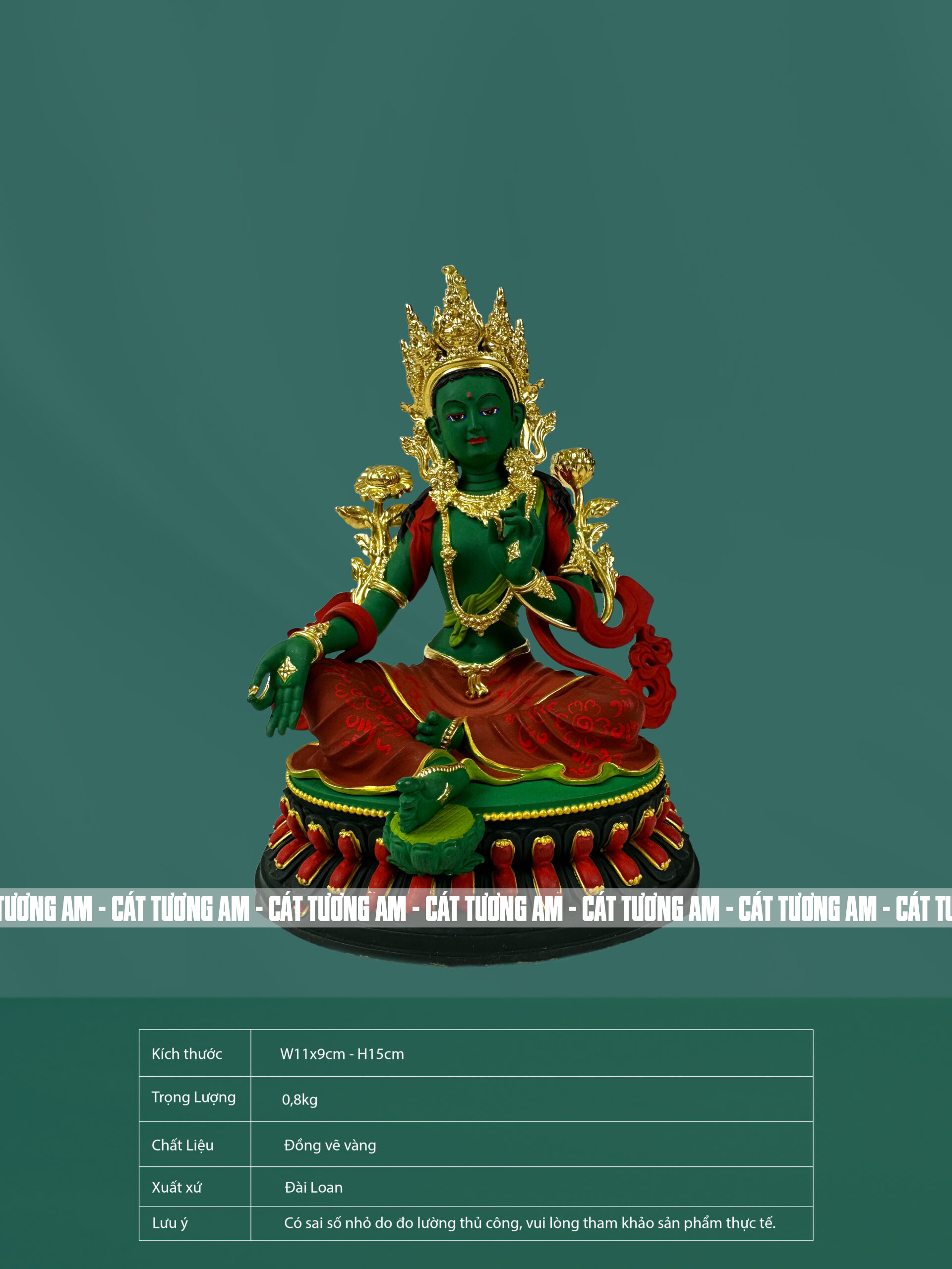 Chất liệu đồng bền bỉ được kết hợp với lớp vàng tinh xảo, tạo nên một tác phẩm vừa sang trọng vừa bền đẹp. Điều này phản ánh giá trị trường tồn của những lời dạy từ Đức Tara Xanh.